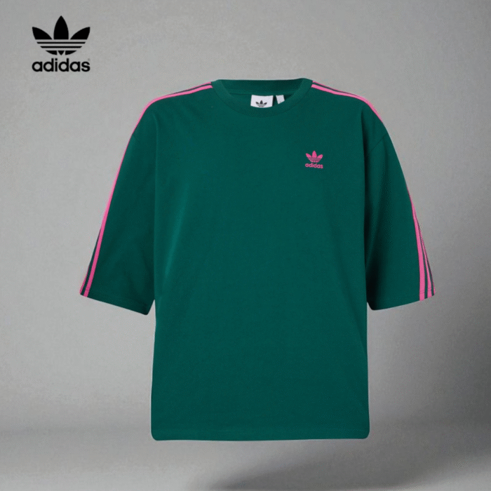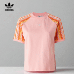 Dieses adidas Originals T-Shirt bringt frische Farben und nostalgische Muster auf stylische Weise zusammen. In zartem Rosa gehalten, wird das Shirt durch die auffällig gemusterten Ärmel in lebhaften Orange-, Rot- und Gelbtönen zum echten Hingucker. Die klassischen 3-Streifen an den Schultern sowie das gestickte Trefoil-Logo auf der Brust sorgen für den unverkennbaren adidas Look.
