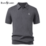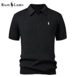 Dieses vertikal gestreifte Strick-Poloshirt bietet einen eleganten Look, der sowohl für den Alltag als auch für formellere Anlässe geeignet ist. Der klassische schwarze Farbton wird durch eine subtile Struktur ergänzt, die Tiefe und Charakter verleiht. Der offene Kragen ohne Knöpfe unterstreicht den klaren Stil und schafft eine moderne Silhouette ohne übermäßige Förmlichkeit.